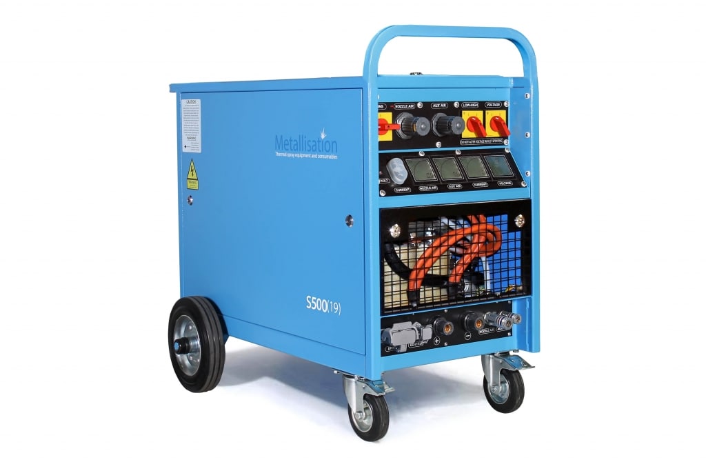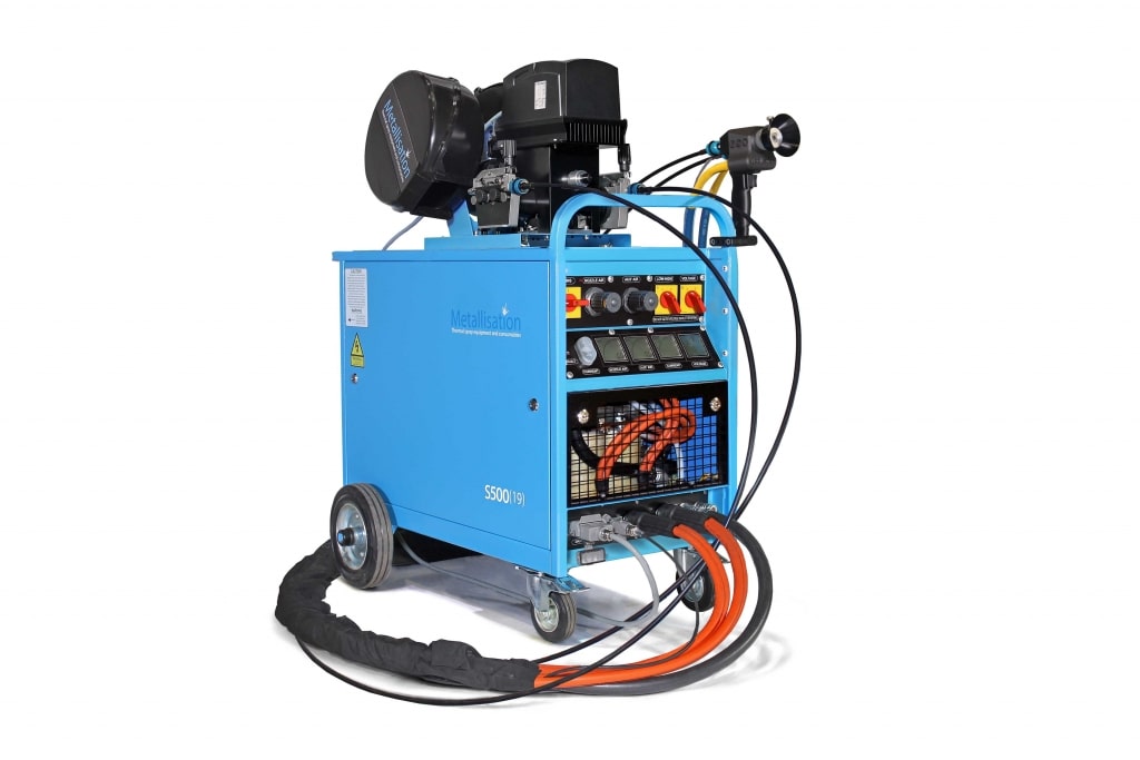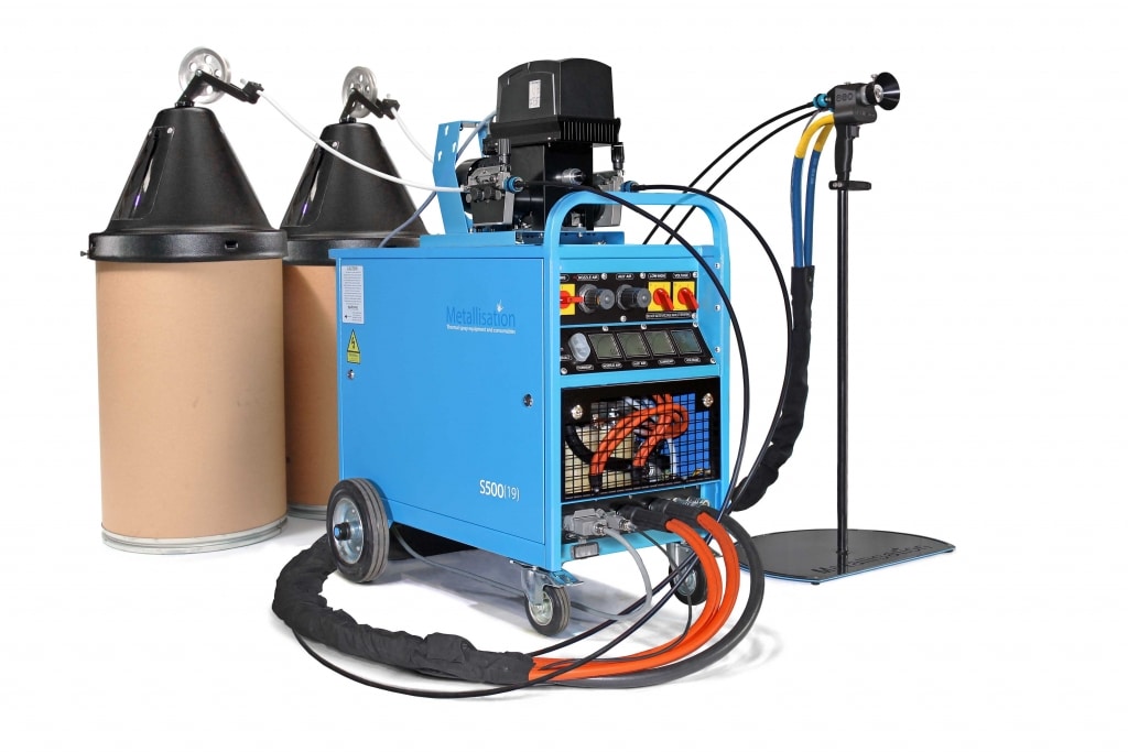 Kompletní zařízení ARC150P pro metalizaci elektrickým obloujem, které kombinuje novou metalizační pistoli se systémem „push“ a novým zdrojem 500 A.