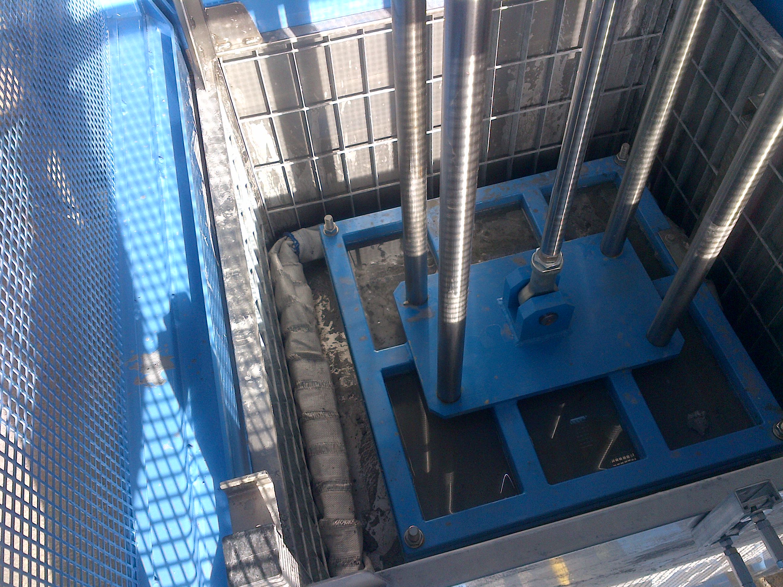 Kal je shromažďován do velkého odpadního pytle, umístěného v nádrži z nerezové oceli se spodním ventilem. V té je kal seshora stlačován pneumatickým pístem.